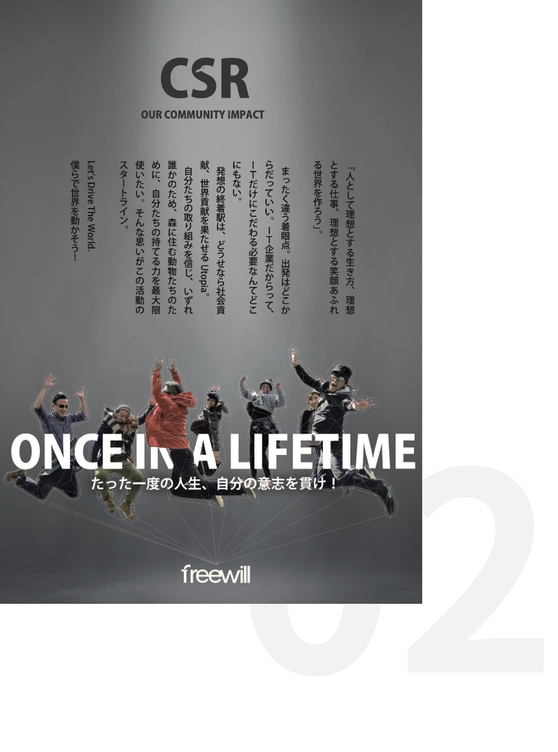 様々な表現方法でクライアントの「想い」を形にしていきます。 Freewillには多種多様なバックグラウンドのデザイナーが所属しており、 様々な角度から社会およびクライントの「想い」を思考し、形にすることで、 より深く、受け手とのコミュニケーションを図れるようにお手伝いします。 「パーパス(目的・意義)」を理解し、 事業内容、Product(製品)などが持つ魅力を引き出しながら、 「想い」を形にし、受け手へと伝えます。